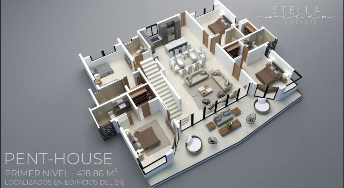 Stella Ocean Residences es un exclusivo complejo de apartamentos que contara con 7 edificios de 5, 6 y 7 niveles, diseñados de forma escalonada de manera que desde cada edificio se puede apreciar la hermosa vista al mar.
