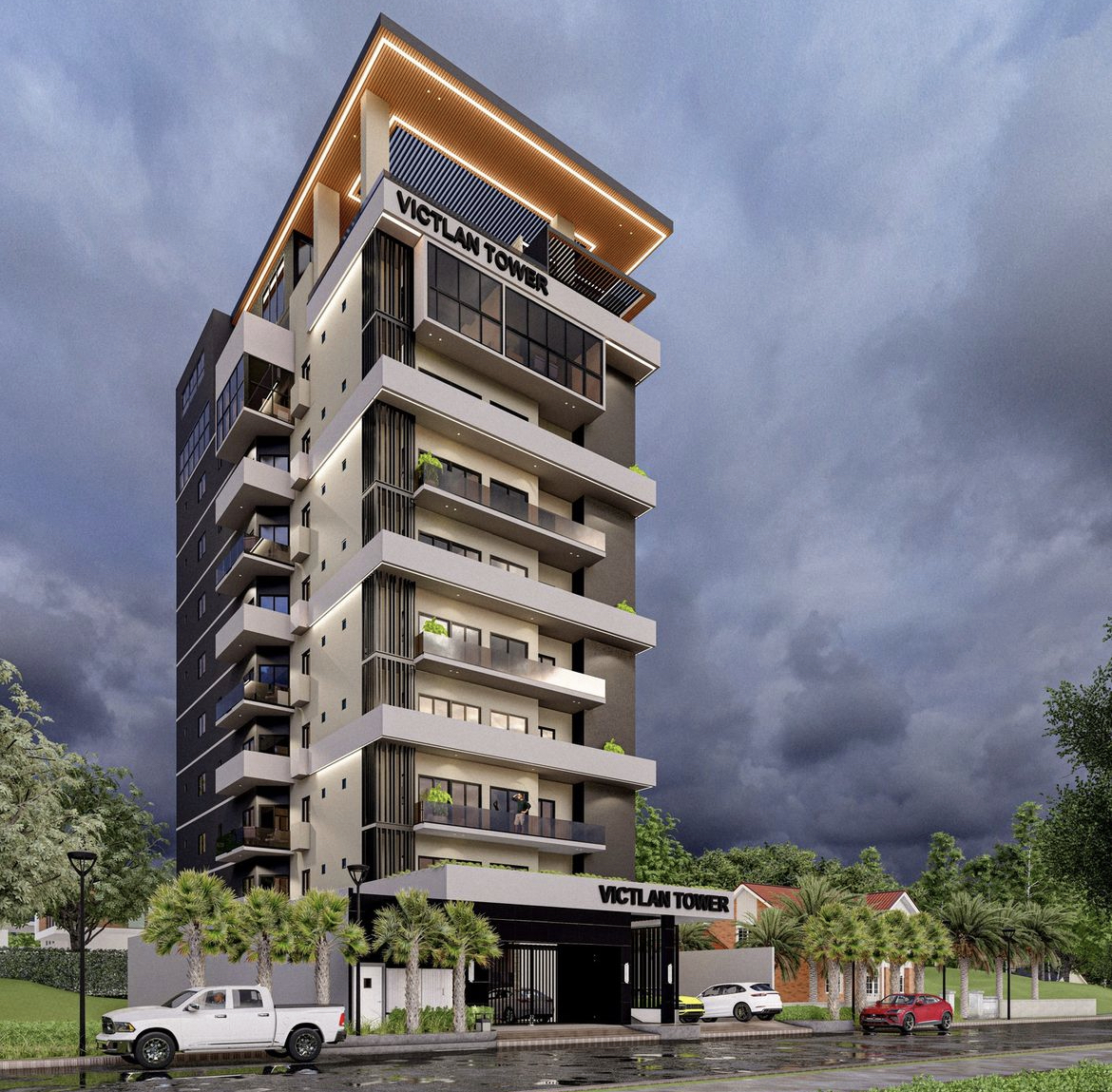 Cuenta con 25 apartamentos incluyendo 4 Penthouse con vista de 180 grados totalmente panorámica a toda la ciudad. Con tres tipologías distintas, dirigido para todos los gustos y necesidades. Apartamentos de dos y tres habitaciones desde 90 m2 hasta 252 m2 neto de construcción, en una torre de 43 metros de altura, construidos en 13 niveles con dos de ellos soterrados.